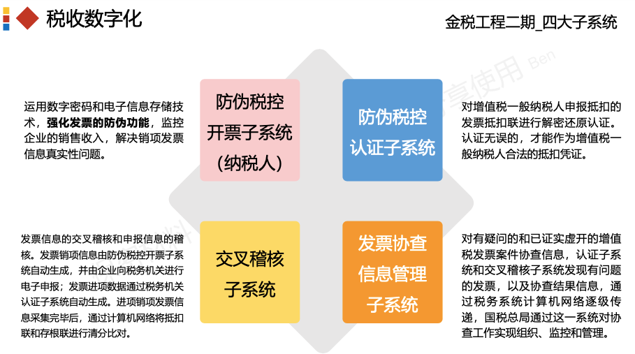 金税工程二期,相较一期,最大的变化是建立起四大子系统,包括防伪税控子系统,当中有开票子系统、认证子系统、发票的协查信息管理系统和交叉稽核子系统。