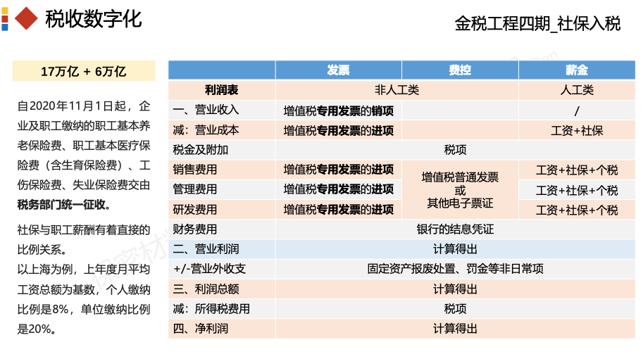 第一是社保入税,从2020年11月1号开始,企业和职工缴纳所得全部由税务部门统一征收。有几个变化,第一是税收所征管的规模变大了,从早期的十七万亿,加上了六万亿的社保,规模达到二十三万亿的量级。第二是社保跟职工薪酬有比较直接的比例关系,以上海为例,上年度的月平均工资为基数,个人缴纳的比例8%,单位缴纳的比例是20%,我在一张企业的利润表中做了划分,把每个科目里跟税收相关的部分列了出来。比如营业收入是增值税专用发票的销项对应的收入,增值税专用发票的进项对应到企业的营业成本,在这两类里,营业成本还会有一些非人工类的,比如员工的薪金原来不在发票领域,现在被纳入社保。