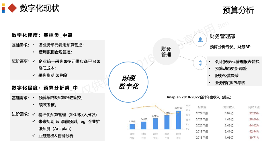 同时,还有事前预测。在企业扩张的时候,希望能够用财税的数字给一些引导,有一家非常知名的海外公司Anaplan在做这块业务,从2018年到2022年,每年都保持30%以上的同比增速,市值表现非常好。