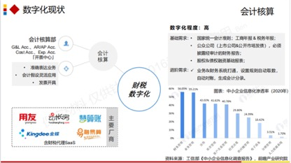 右下这幅图,是工信部关于中小企业信息化的调查报告,观察可知,财务管理的信息化渗透率在2020年已经达到了56%,一方面,以金蝶、用友为代表的厂商在财税领域的数字化普及方面做出了努力;另一方面,无论是境内还是境外的企业都有会计核算的需求,需要按照会计准则的要求去做财务报表,提交工商的年报、税务年报等等,上市公司还要定期披露季报、半年报、年报。还有一些公司如银行间市场或者债券市场的公开市场发债,也必须要按照交易所的要求披露定期报告。此外,无论是股权融资中私募机构做尽调,还是债券融资银行放贷款,都需要企业的财务报表。