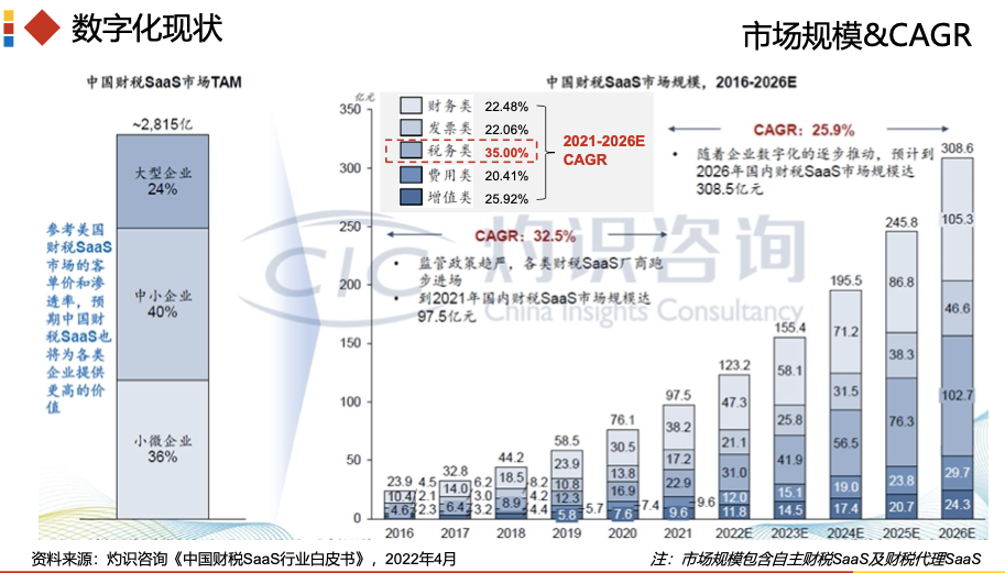 根据灼识咨询今年4月份出炉的中国财税SaaS行业白皮书,中国的财税市场分成了财务类、发票类、税务类、费用类和增值类。在2021年到2026年,复合增长率预计可以达到25.9%,税务类的复合增长率更是达到了35%。