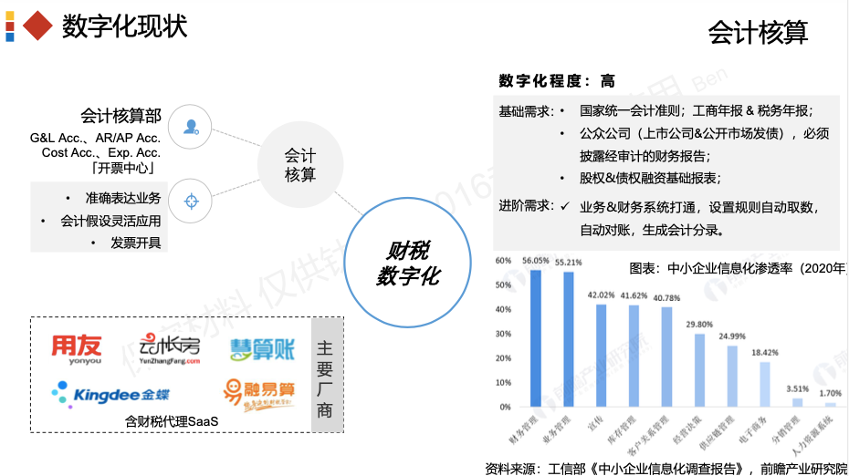 会计核算领域,很早就有了远近闻名的厂商,例如用友和金蝶,在财税里核算的渗透率已经非常之高。