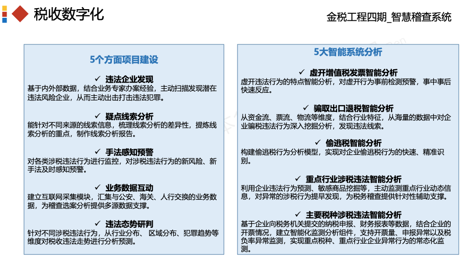 金税四期工程从2020年年底的这两个招标文件面世起算正式启动。稽查系统需要很多功能,包括违法企业发现、疑点线索分析、手法感知预警等。五大智能系统,包括虚开发票骗取出口退税,偷逃税智能分析,重点行业涉税违法智能分析等等。在税收的数字化达到一定程度以后,税收监管会更加透明,企业和个人的涉税行为也会越来越透明化。