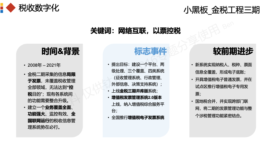 金税三期的关键词是网络互联、以票控税。时间跨度相对比较长,从2008年开始到2021年,把金税二期的一些仅限于发票的工程做了整合升级,同时期望建设一个业务覆盖更全面、功能更强、大全国联网运行的税收信息管理系统。当中有一些标志性事件,包括前面提出的“一二三四”,金税三期的并库版系统上线,增值税发票管理系统2.0版本的上线以及全国推行,增值税电子发票系统等等。整个金税三期较二期有跨越式进步。