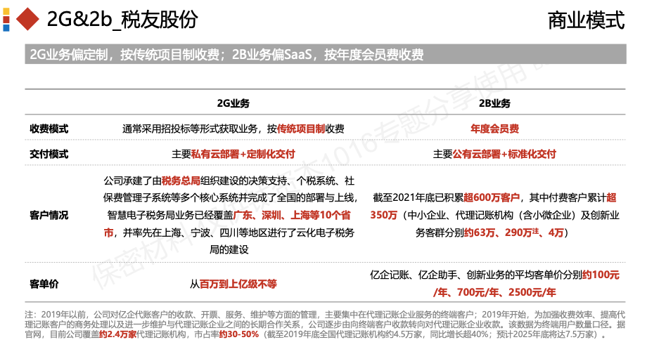 招股书中披露的几个数据比较有意思。第一,税务局的预算投入非常大,国税总局在2020年给税友贡献的销售收入2.4个亿。税友有两大块收入,一块是2G的,占到了50%,七个亿左右,然后2B还有一块八个亿左右,支撑起了这样的上市公司。2G里面,除了税友以外,还会有中软、东软等公司,这个领域进入门槛非常高,一旦进去以后可能拿到非常大额的订单。