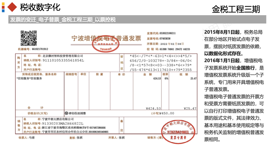 下面这张发票是金税三期的增值税电子普通发票,这张发票有几个特点。第一,它叫增值税电子的普通发票,不是专用发票。第二,发票里所有的信息已经全部电子化。2015年8月1号税务总局在部分地区开始试点电子发票,逐渐摆脱对纸质发票的依赖。从2016年的1月1号开始增值税电子发票系统开始全国推行,后续持续推广。