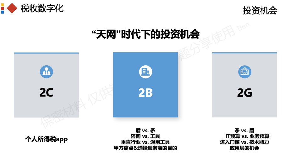 我在传统的2C、2B、2G三个方向做了一些思考。先看2C方向,未来很长一段时间,国内的个税数字化可能是个税App包打天下的局面,所以在2C领域可能没有特别好的数字化工具的创业机会,也没有特别好的投资机会。