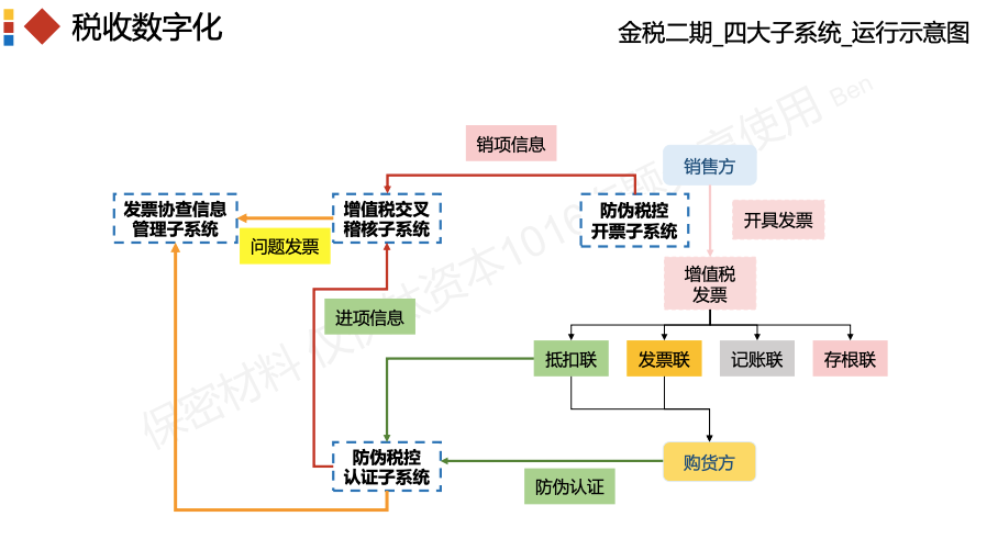 举一个实际案例,所有的增值税都有一个销售方来开具销售行为中增值税发票,针对一张增值税专用发票,一个抵扣联是给买方做经销税抵扣的,还有个发票联也是给买方的,有个记账联是销售方自己的,还会有个存根联。买方在拿到抵扣联跟发票联以后,会去做防伪认证,这时就使用防伪税控的认证子系统,这两个系统都由购货方通过认证子系统输入进项信息,销货方通过防伪税控开票子系统输入销项信息。这两个信息汇集到增值税的交叉集合子系统以后做集合,信息如果匹配得上,就是符合标准的发票。这四个系统是金税系统的重要基石。