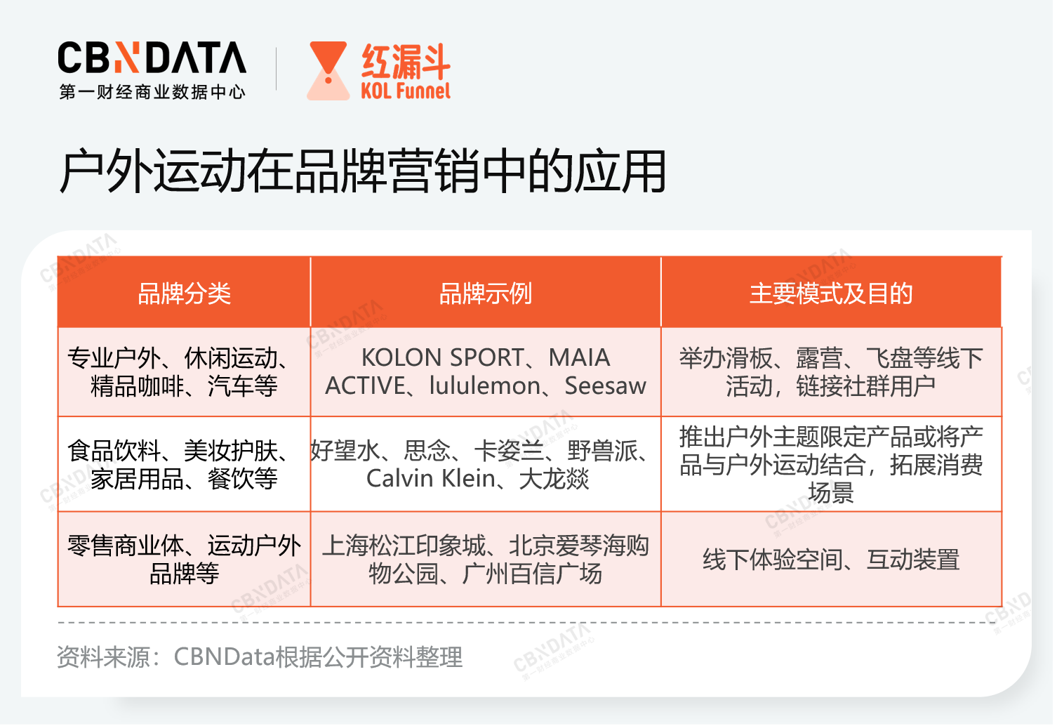 或许这可以解释休闲运动、食品饮料、美妆护肤、家居用品品牌争相与户外运动结合的原因。CBNData梳理了品牌们的营销玩法,发现大致分为三种类型。