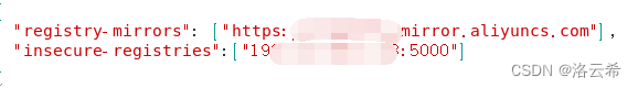 registry-mirrors是之前设置的阿里云镜像加速(不是本文章设置的),主要方便拉取镜像。(ps:如果没有设置过的,建议设置一下,centos7中下载docker_洛云希的博客-CSDN博客 这里的第三点,设置阿里云镜像加速)