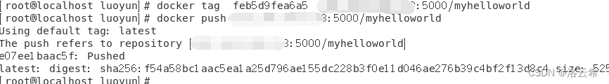 ps:镜像Id:Tag 不写tag表示为最新版本。tag为修改命名规范,这里将要推送的镜像名字修改为规范的ip地址:端口号/名。 push表示推送该镜像。