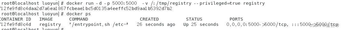 然后运行下面代码,启动一个registry容器。-d表示后台守护模式启动,-p指定端口映射,这里指使用linux的5000端口指向docker的5000, 这里的5000即json文件里设置的。