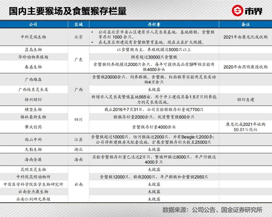 据了解,昭衍新药从2017年开始介入,在梧州、苏州、广州等地区自建实验猴养殖基地,2022年收并购两家猴场。药明康德2019年收购广东春盛猴场,2022年在南通计划建设药物安全性评价和测试实验室。此外,美迪西、康龙化成等也在积极囤猴。