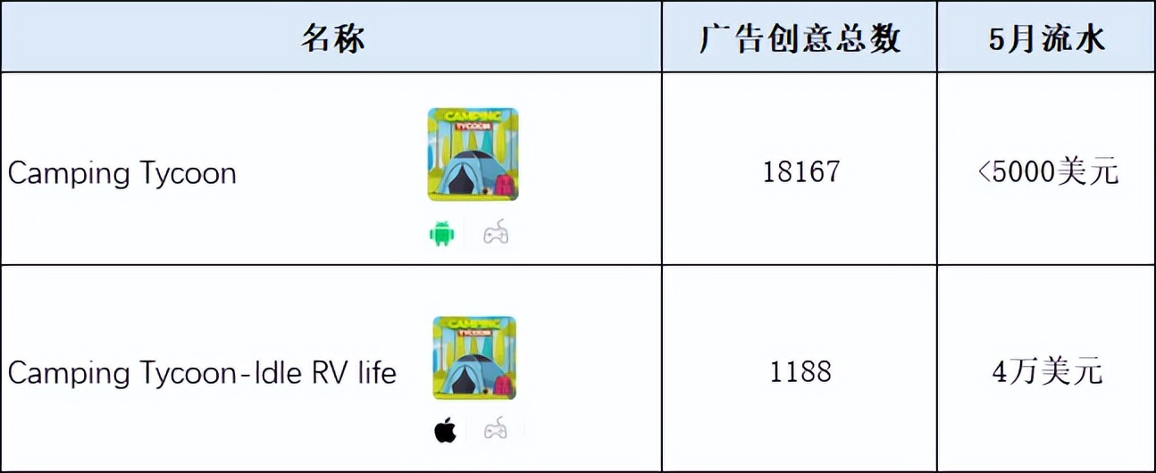 从投放总量上看,《Camping Tycoon》在安卓端和 iOS 的投放几乎不是一个量级 | 数据来源:广大大、Sensor Tower