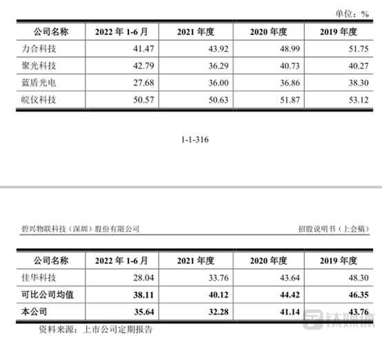 与此同时,报告期内,碧兴科技的毛利率分别为43.76%、41.14%、32.28%、35.64%,同行业可比公司平均值分别为46.35%、44.42%、40.12%、38.11%,其中2021年碧兴科技的毛利率较同行可比公司低了近8个百分点。
