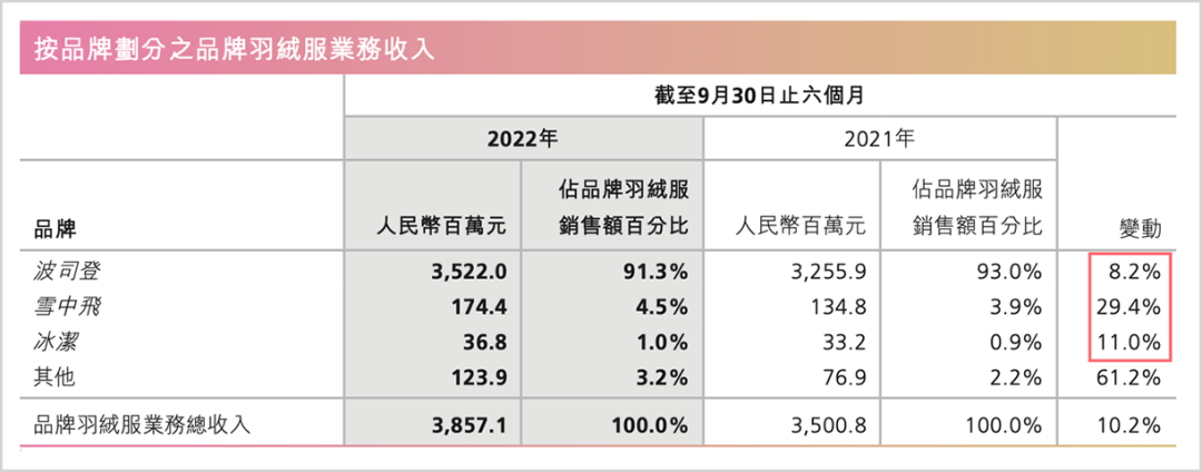 在波司登的矩阵中,波司登主品牌为主攻高端,雪中飞聚焦中高端,冰雪定位大众消费市场。从三者最新的表现来看,波司登主品的收入增长也要低于后两者。而且,波司登主品牌上一财年增速还有16.3%,最新的半年报直接减半。