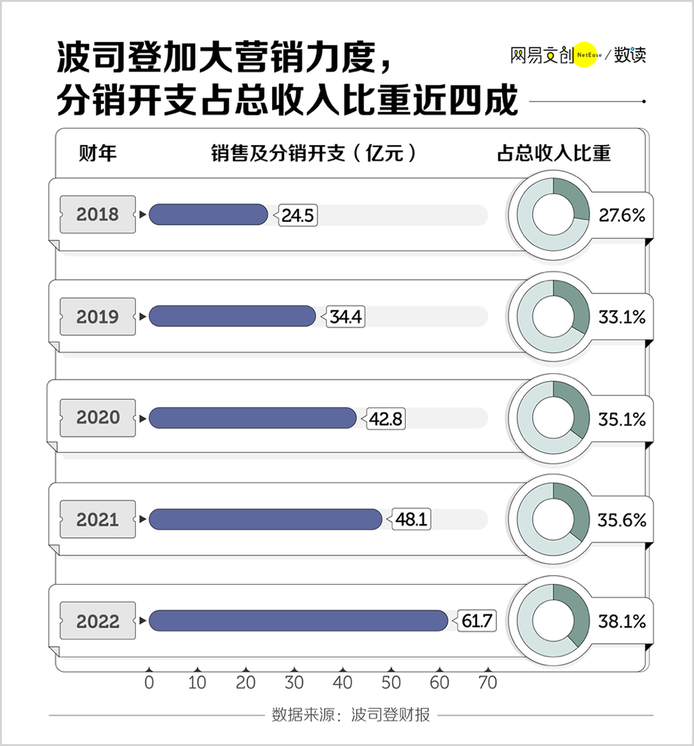 2018-2022财年,波司登销售分销开支上涨了1.5倍,占营收比例从27.6%上升到38.1%,接近4成。