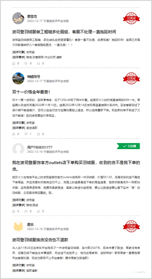 在黑猫投诉平台上,对波司登的投诉已经有800多条,远高于同行,投诉问题主要集中在产品质量差、虚假宣传、售后服务不到位等问题。