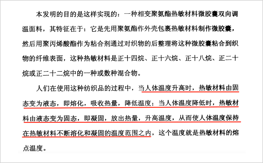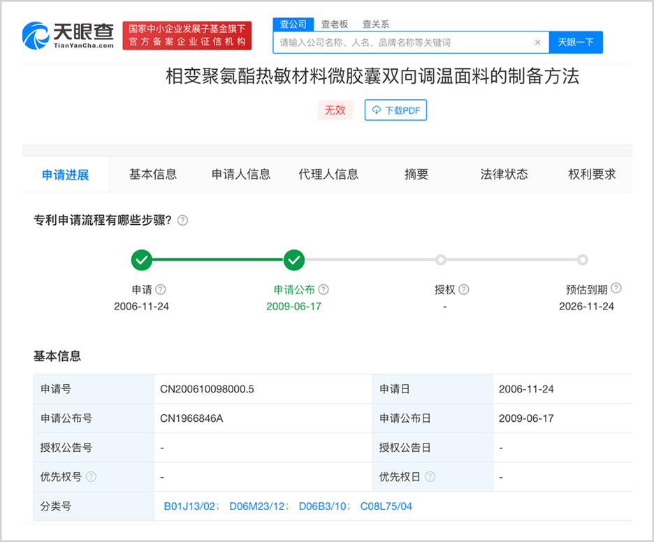 天眼查显示,2006年,一种双面调温面料的技术专利技术就已经在申请专利之中,资料显示,其生产难度小。