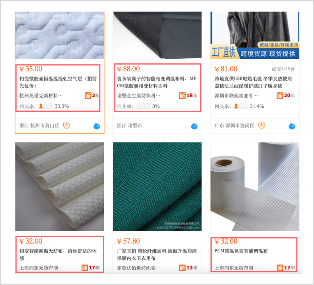 在阿里巴巴1688平台,多家企业都在批发这种技术的面料。杭州英诺克已发起申请了多项专利,该公司售卖的PCM变相材料最贵的为450元/千克,面料价格仅35-60元/米,价格低廉。
