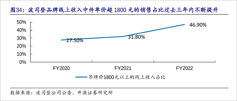 开源证券研报显示,波司登线上1800元以上的羽绒服占比由2020年的27.5%上升到2022年的46.9%。**“未来波司登羽绒服价格还将持续上涨,均价会达到2000元以上。”**波司登品牌事业部总裁芮劲松曾公开说道。