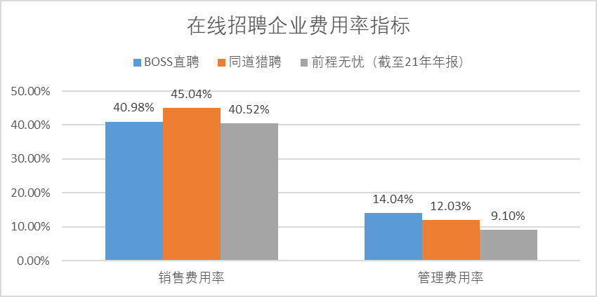 不同于其他互联网企业止不住烧钱陷入无限战争,在经历了快速烧钱扩张后,BOSS直聘的费用率水平迅速降低,毛利率领先同行。截至2022年中报,BOSS直聘的费用率水平已经与其他在线招聘企业无异。