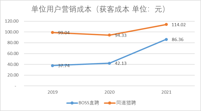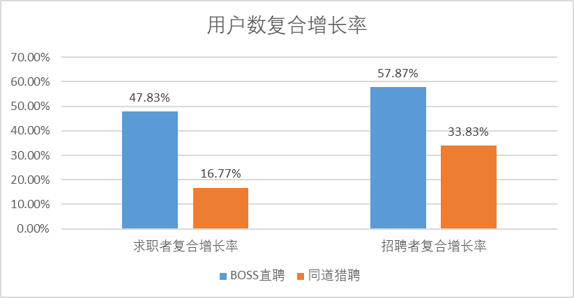 BOSS直聘销售费用绝对值非常高,不过好在转化效率也很高。我们对比了BOSS直聘和同道猎聘的销售费用转化率(获客成本)。可以看出 BOSS直聘在获客成本方面实际远小于同道猎聘 。在用户复合增长率方面,BOSS直聘也遥遥领先。