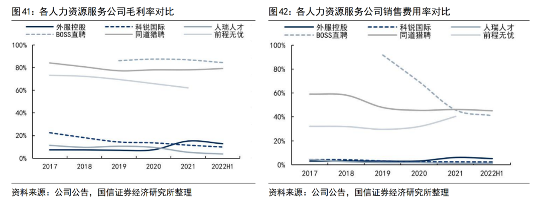 图:各人力资源服务公司毛利率及销售费用率,来源:国信证券经济研究所
