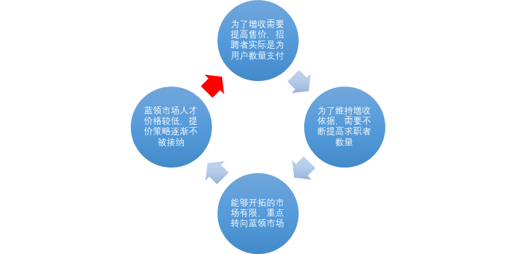 在这里产生了一个增长的逆循环,作为招聘者付出了更高昂的价格,如果没有更好的效率,本质上是为了求职者数量增加而买单。而白领用户的渗透率已经很高,想要持续增收提价就需要大量的蓝领用户来保持用户增量,而蓝领用户的需求方价格敏感系数又很高,求职者的价值也会打折扣,产品套餐提价买单的人就会减少。