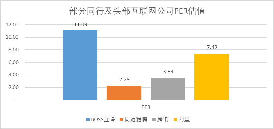 我们用PER( 含债调整PE/ROE )来对比BOSS直聘与同行乃至成熟互联网巨头的估值可以看到,BOSS直聘的估值远高于同行,也高于腾讯阿里这样的成熟互联网巨头。