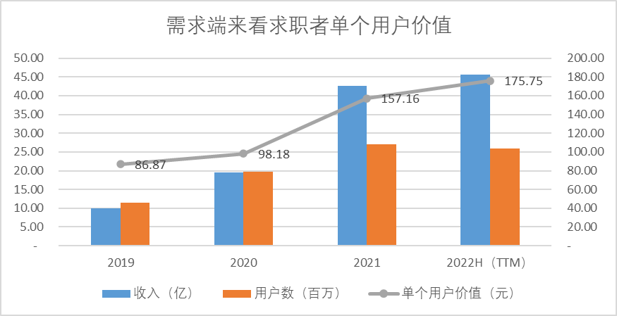除此之外,对于整个产品而言, BOSS直聘的价格曲线与蓝领招聘的内核有差异 。我们以BOSS直聘的视角来分析,以活跃用户量和收入的关系计算单个用户的产品价值。目前来说单个用户价值已经由2019年的86.87元增长至175.75元。