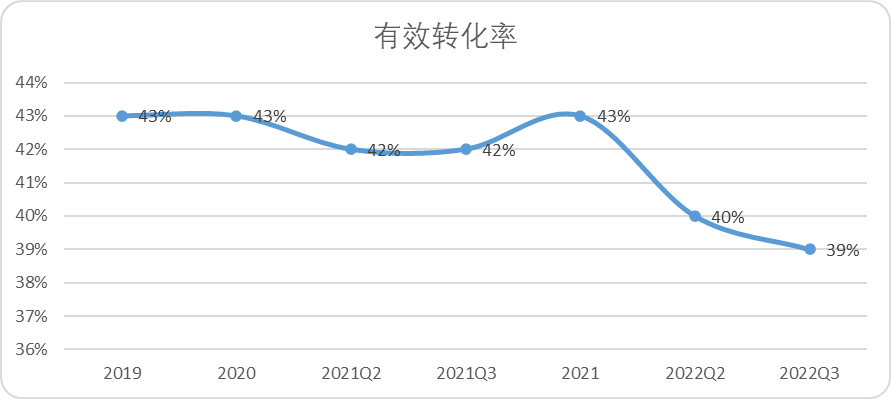 当然也有人说这个数据不能精准的反映问题,因为也许是用户数量在增长,我们之前分析了BOSS直聘的用户数量其实并没有显著的增长,同时我们再来看招股书中披露的 有效转化率 ( 依据推荐完成联络的招聘次数比率 ), 也是呈下降的态势 ,并且在2022年三季度新用户放开注册后依旧没有改善。