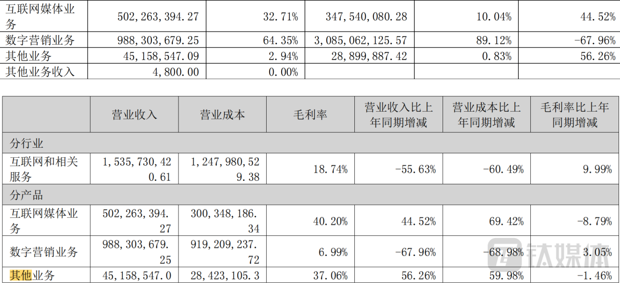 虽然智度股份强调,公司拥有完整的区块链底层技术、丰富的互联网媒体运营经验、广阔的数字营销渠道以及游戏分发能力,能为公司“Meta 彼岸”提供区块链底层技术支持、应用分发及推广服务,但是公司主要的收入来源仍是数字营销业务和互联网媒体业务。2022年中报显示,前者在公司整体营收中的占比64.35%,毛利率为6.99%,完全属于走量类型;后者占公司整体营收32.71%,毛利率为40.20%,是其主要的利润来源,而其他业务员仅占2.94%,毛利率为37.06%。
