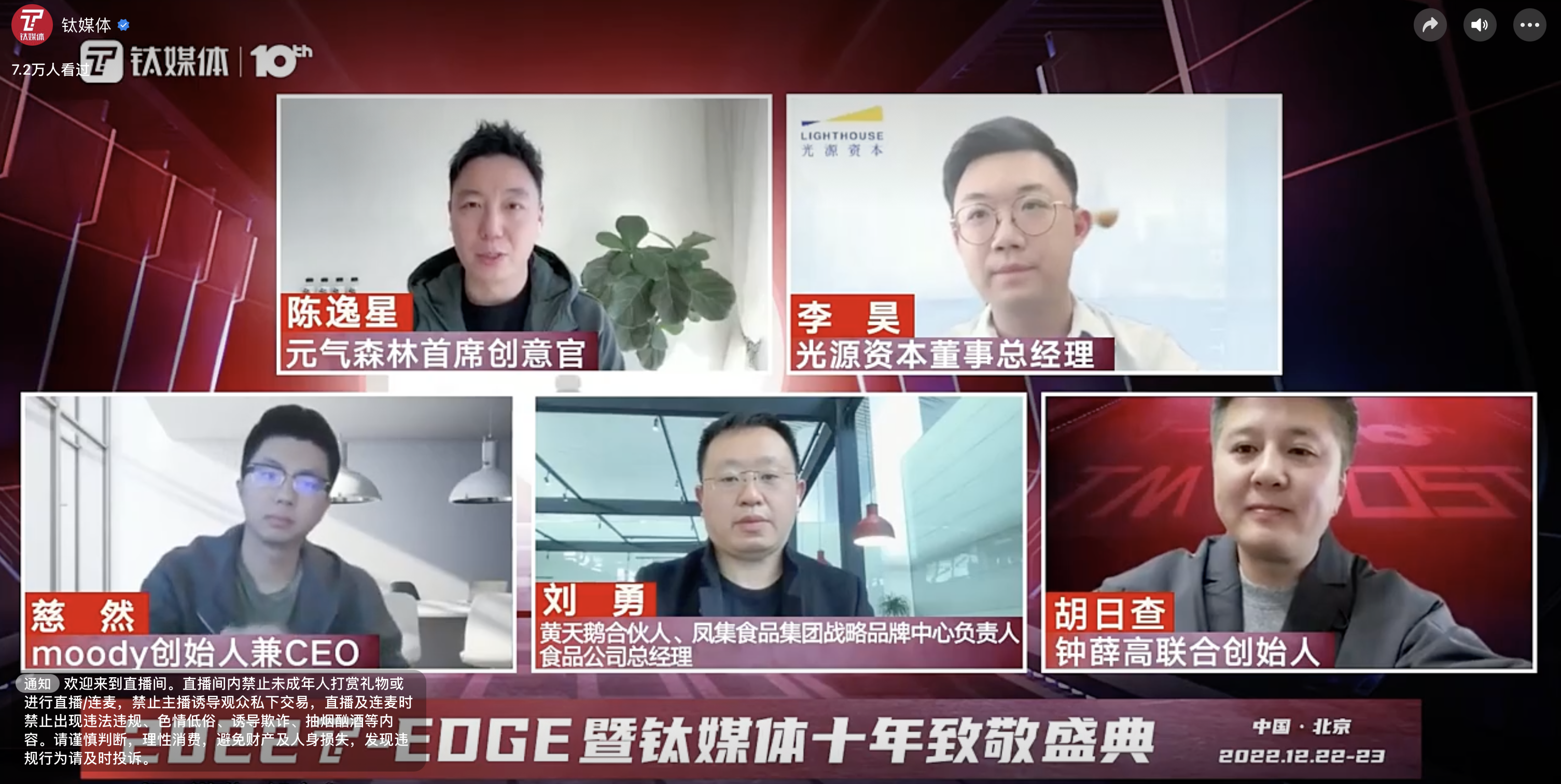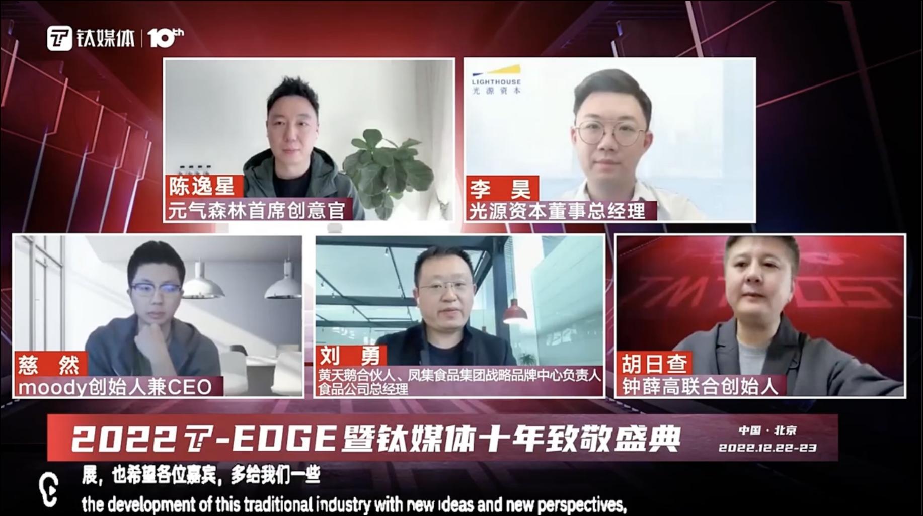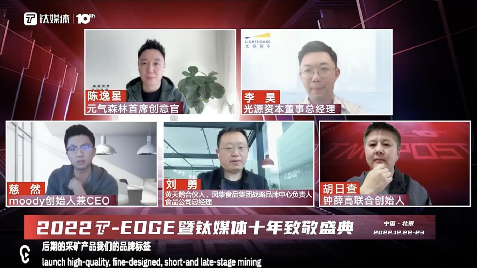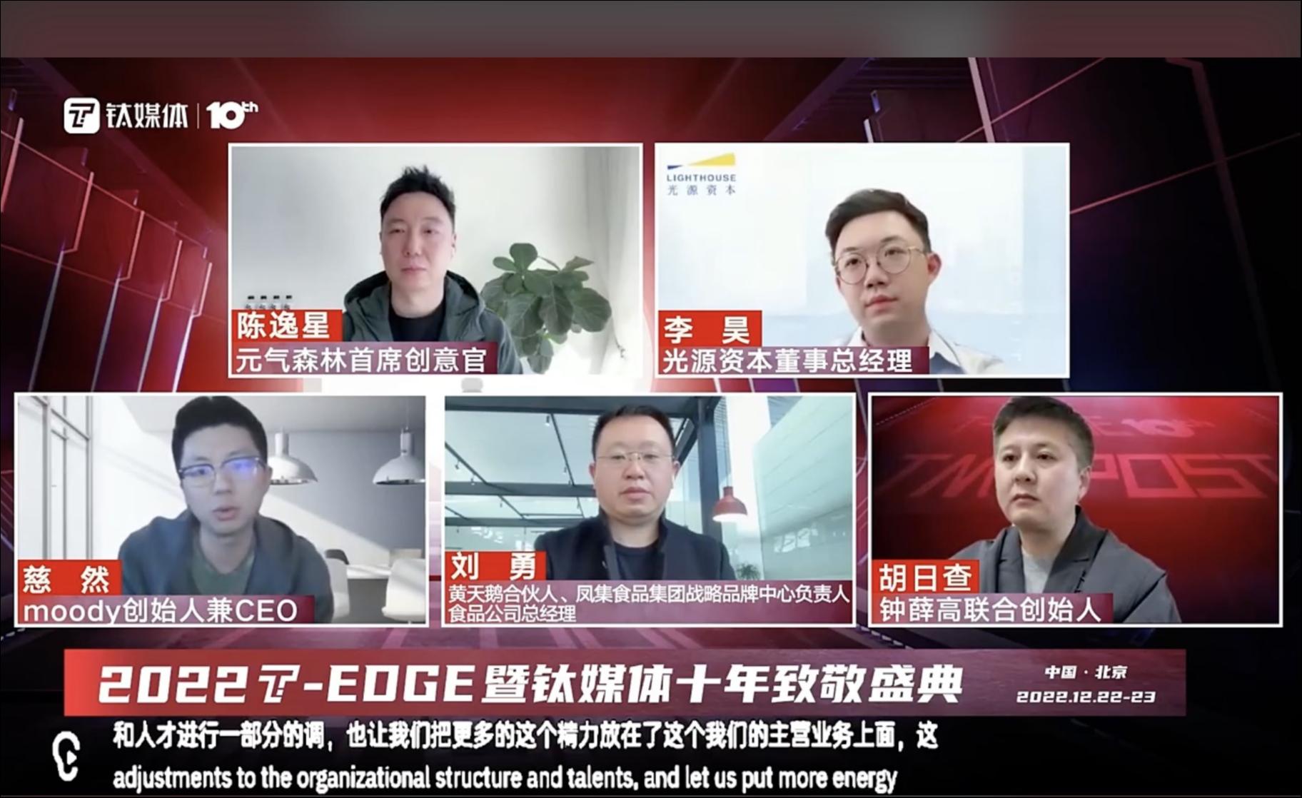 12月23日,在钛媒体2022 T-EDGE全球创新大会上,圆桌对话环节邀请到了光源资本董事总经理李昊,钟薛高联合创始人、副总裁胡日查,黄天鹅合伙人、凤集食品集团战略品牌中心负责人、食品公司总经理刘勇,元气森林首席创意官陈逸星,moody创始人兼CEO慈然,围绕着“如何迎接新消费的下个五年”主题展开了深入交流与分享。