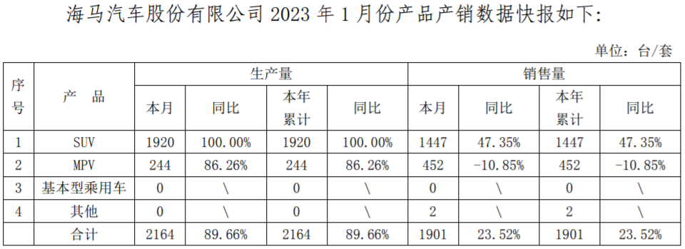 2月8日晚间,海马汽车发布了2023年1月份产销数据,1月份汽车销售量合计为1901辆,同比增长23.52%,月环比下降10.71%。