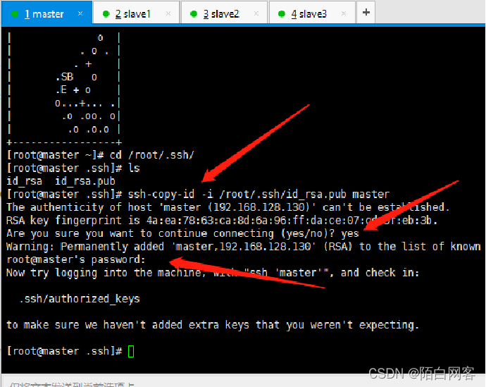 (2)用ssh-copy-id 将公钥复制到远程机器中。执行下边命令 将公钥复制到远程机器中的命令 ssh-copy-id -i /root/.ssh/id_rsa.pub master //依次输入 yes ,123456(root用户的密码)