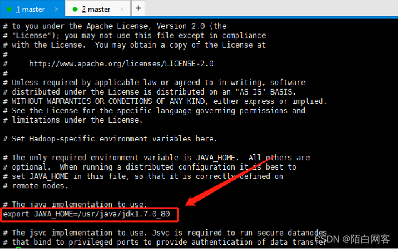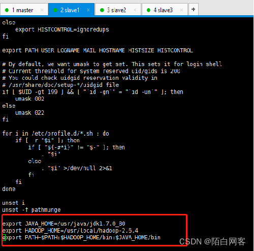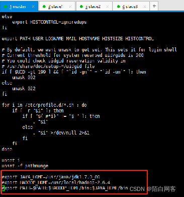 配置环境变量是在master、slave1、slave2、slave3上修改 /etc/profile 文件,在文件末尾添加代码 如下所示内容,文件修改完保存退出。
