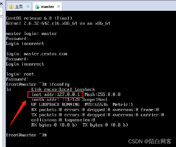 它现在已经进入到这个虚拟机里面了,那我们来查看一下它目前的ip. 那我们输入ifconfig 来查看IP。它目前所有虚拟机的IP是127.0.0.1。每个虚拟机创建之后都是这个IP,所以呢,我们链接到指定的虚拟机就需要重新设置IP。