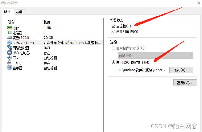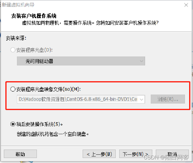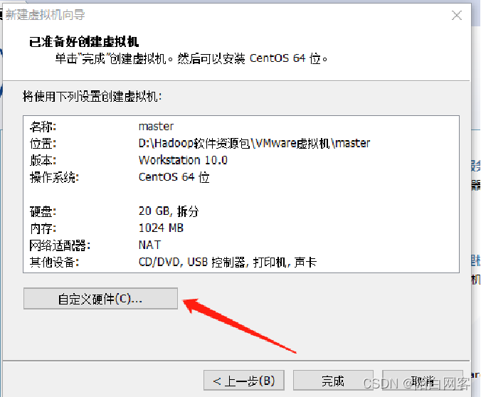 点击这里的自定义硬件,选择第三个,然后选择iso使用映像文件来创建这个虚拟机。点击关闭,然后点击完成。就完成master虚拟机的设置了。