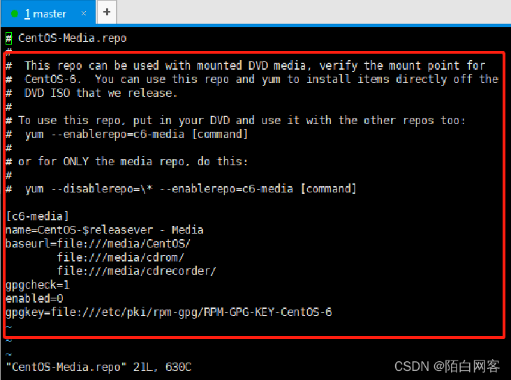 3、执行命令 vi CentOS-Media.repo 打开文件,如下图,修改其内容 Baseurl 就是它下载软件的位置,这里它提供了3个位置,我们只保留一个位置,其它两个位置删除。 将gpgcheck的值改为0 将enabled的值改为1