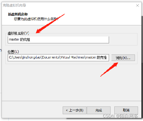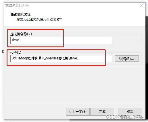 (4)设置新虚拟机的名称。新虚拟机名称为slave1,选择安装位置为之前建好的位置,单击完成按钮,虚拟机开始克隆。