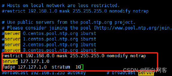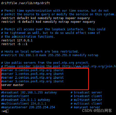 (2)设置master节点为NTP服务主节点,那么其配置如下。 使用命令 “vim /etc/ntp.conf”来打开 /etc/ntp.conf文件,注释掉以server开头的行,并添加代码