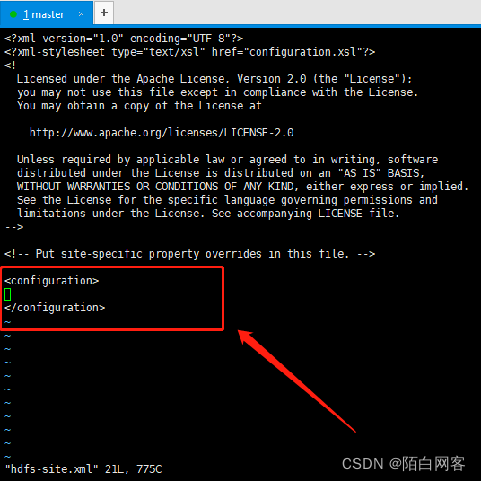 (8)修改yarn-site.xml文件。该文件是YARN框架的配置。执行命令:vi yarn-site.xml