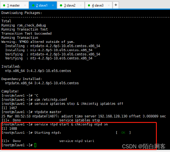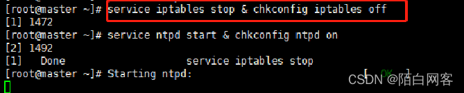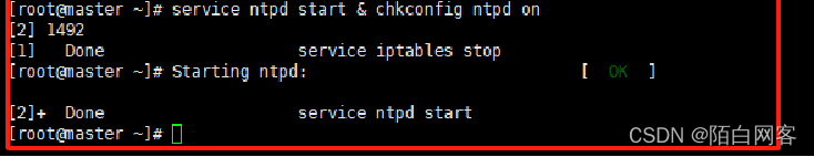 ①在master节点执行命令“service ntpd start & chkconfig ntpd on”,如图所示,说明NTP服务启动成功。
