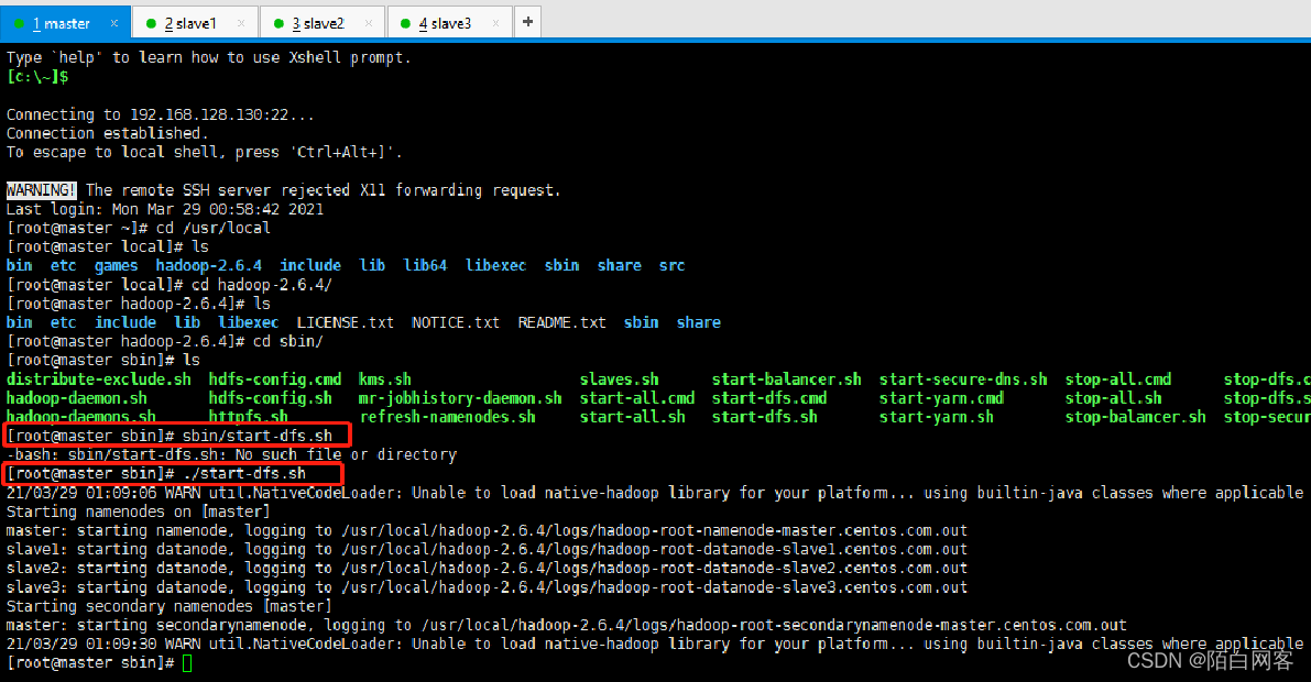 集群启动之后,在主节点master,子节点slave1、slave2、slave3分别执行“jps”命令,说明集群启动成功。