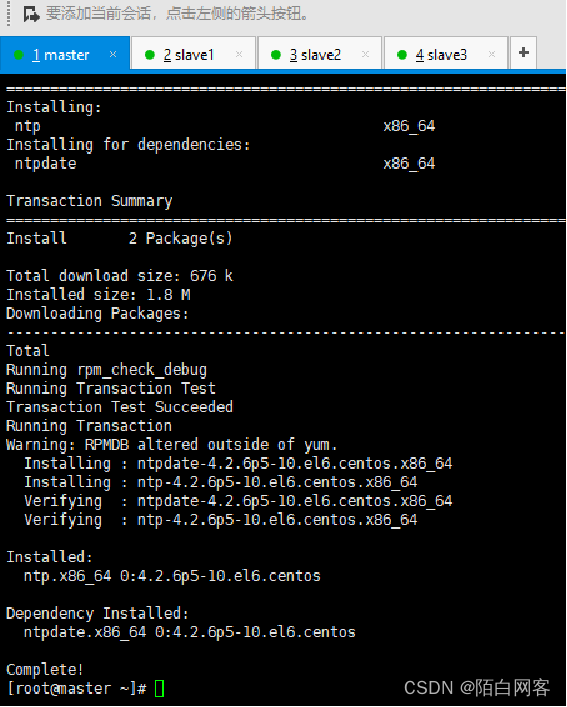 (1)安装NTP服务。 在任务2.1的时候已经配置了yum源,可以直接使用yum来安装NTP服务,在各节点执行命令 yum install -y ntp即可。若是最终出现了“Complete”信息,就说明安装NTP服务成功。