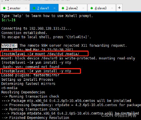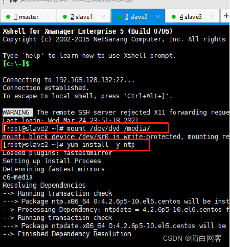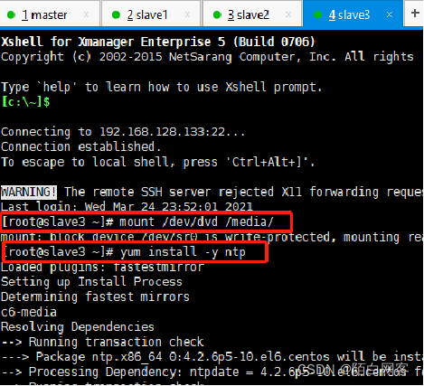 然后:去各个子节点上(slave1、slave2、slave3)分别 挂载 yum 源,安装ntp
