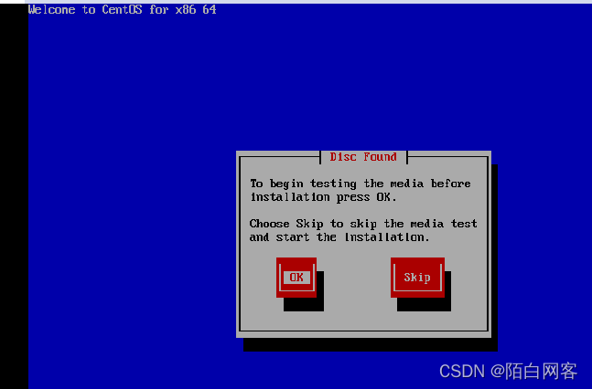 弹出“Disc Found”对话框,选择“OK”来测试安装媒体,即DVD光盘,如图所示。选择“Skip”表示跳过,进入下一个界面之后直接单击“NEXT”按钮。