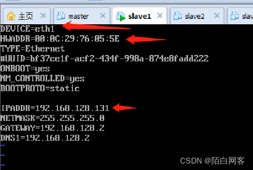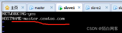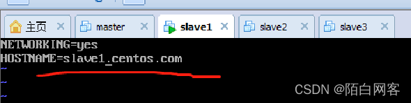 ④修改机器名。 执行命令: vim /etc/sysconfig/network 修改机器名为 slave1.centos.com