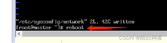 然后我们按esc退出编辑,然后按:wq(按冒号的时候按着shift键),然后再按enter,这样它就把这个内容保存了。完成之后我们拉到页面最下方,我们重新输入 service network restart重启网络服务